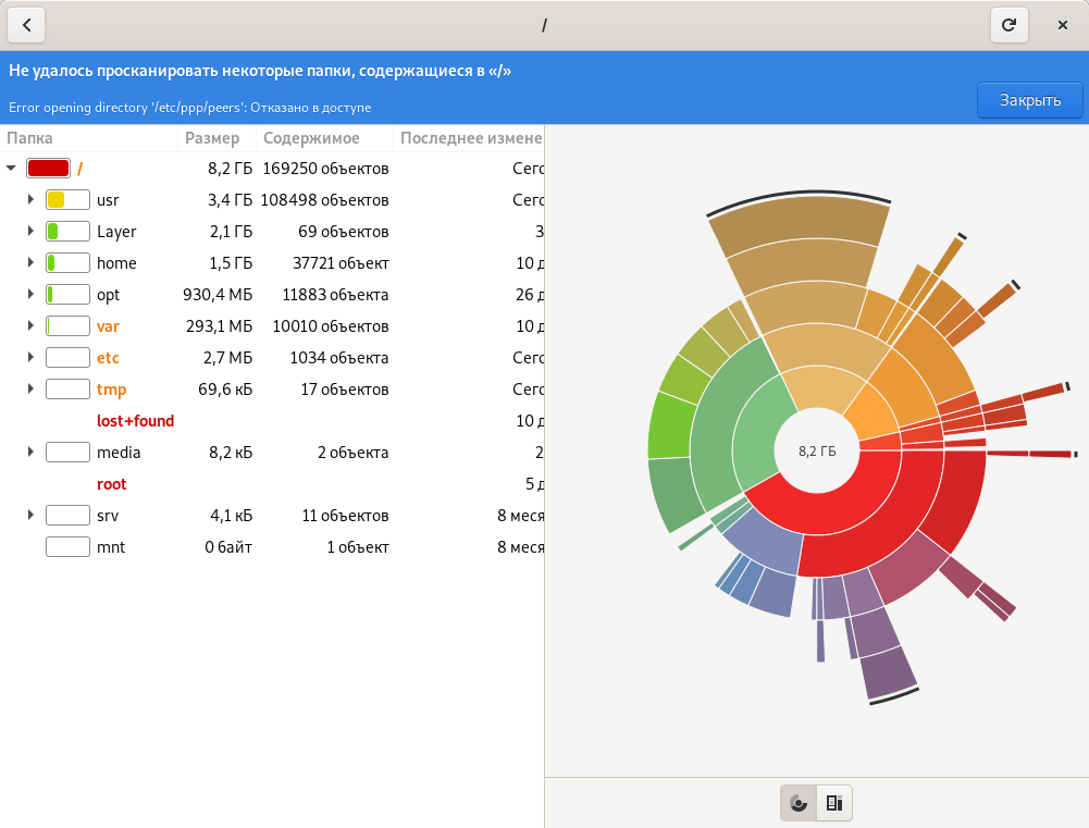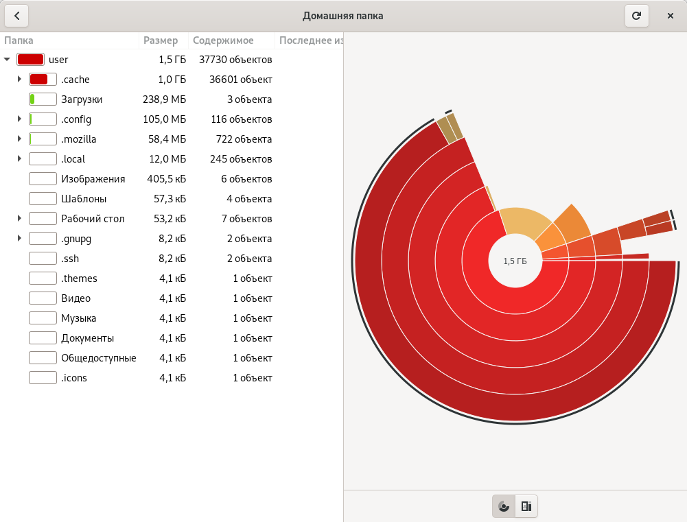 Программа Анализатор использования дисков это аналог известной в windows программы WinDirStat. С ее помощью можно посмотреть как полное дерево файловой системы, так и её отдельные папки.