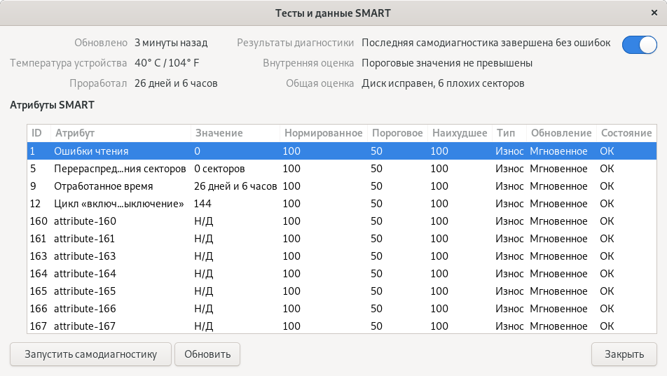 Для просмотра данных самодиагностики и SMART , откройте меню и выберите данные самодиагностики и SMART.