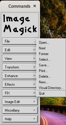 содержит параметры Открыть, Следующий, Прежний, Выбрать, Сохранить, Распечатать, Удалить, Создать, Визуальный каталог и Выйти. Выберите выбирает конкретный файл изображения для отображения, визуальный каталог показывает все файлы (а не только изображения) в текущем рабочем каталоге. Если вы хотите прокрутить все выбранные изображения, вы можете использовать Следующие и предыдущие, но проще использовать их сочетания клавиш (пробел для следующего изображения и пробел для предыдущего).