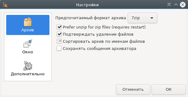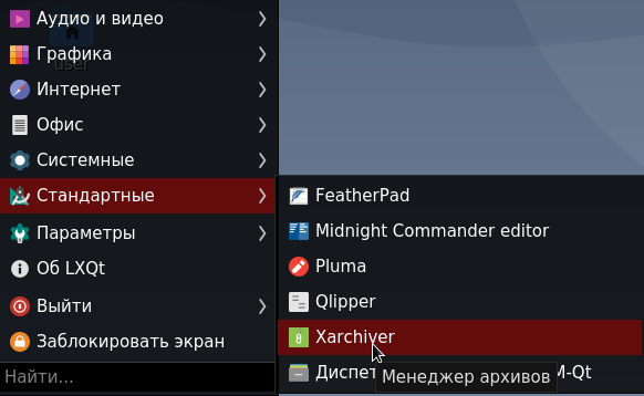 2. Далее выбрать пункт Стандартные и выбрать вкладку Xarchiver.