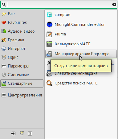2. Далее выбрать пункт стандартные и выбрать вкладку Engrampa.