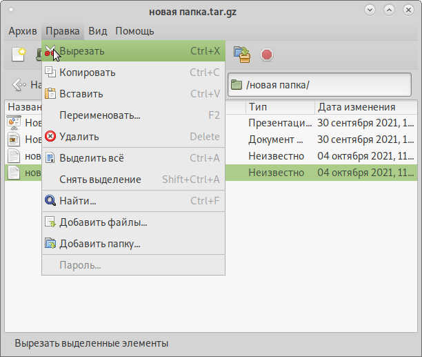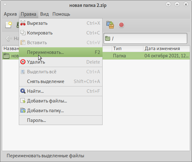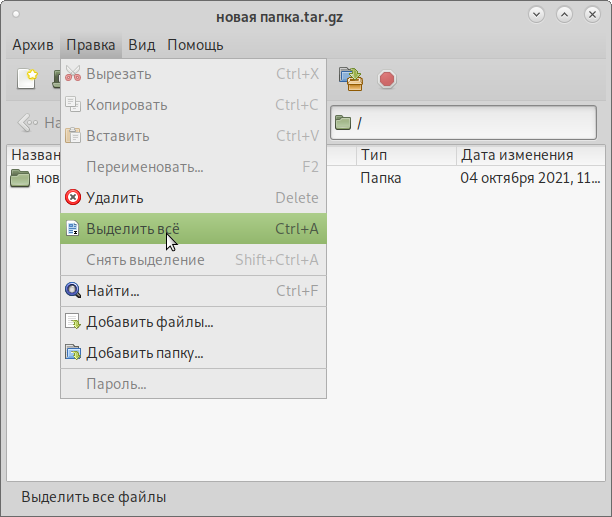 Для выделения всех файлов в архиве выберите Правка ▸ Выделить все или нажмите Ctrl+A.