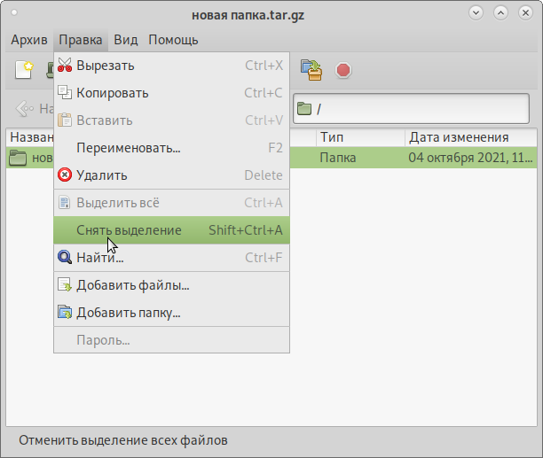 Для снятия выделения со всех файлов в архиве выберите Правка ▸ Снять выделение или нажмите Shift+Ctrl+A.