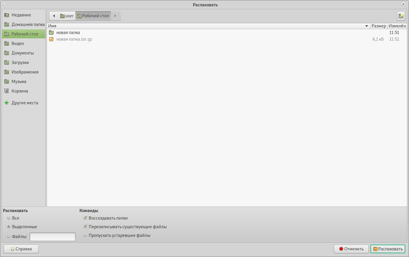 2. Выберите Архив ▸ Распаковать, чтобы октрыть диалоговое окно Распаковать. Или щёлкните на кнопке Распаковать в панели инструментов.