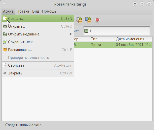 1. Выберите Архив ▸ Создать, чтобы открыть диалоговое окно Создать. Можно вместо этого нажать Ctrl+N или щёлкнуть на кнопке Создать новый архив в панели инструментов.