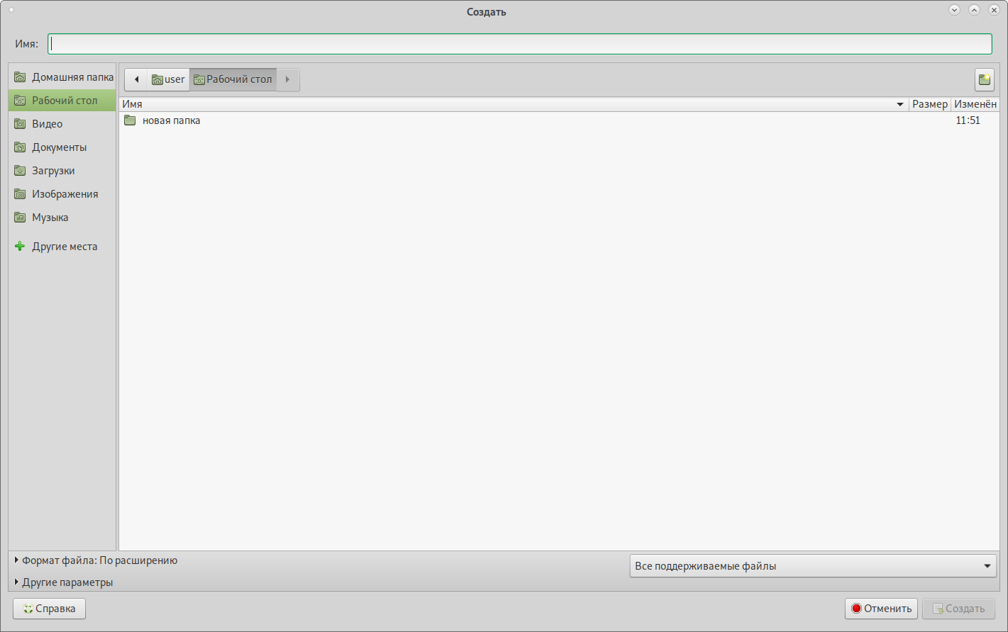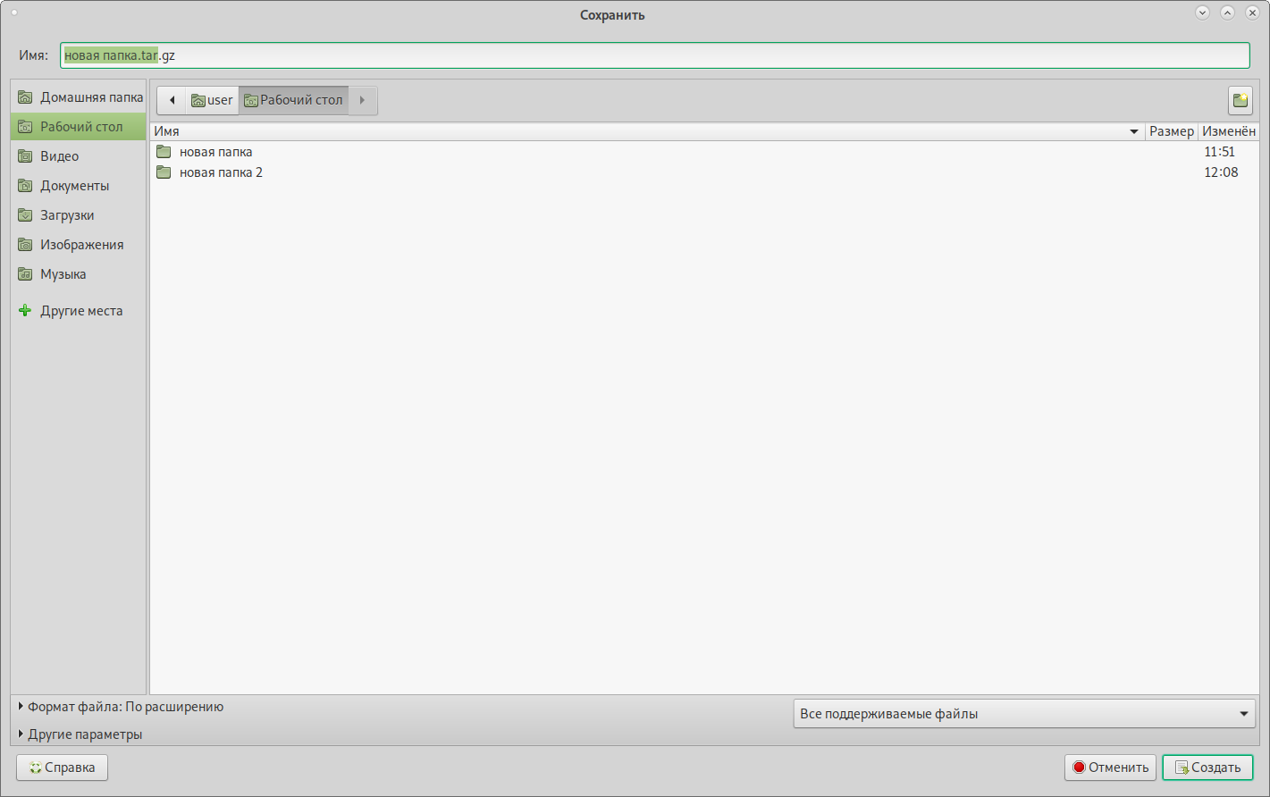 3. Введите имя нового архива, включая расширение файла в текстовом поле Имя. Можно также указать имя архива без расширения, а затем выбрать тип архива из выпадающего меню Формат файла, тогда расширение будет добавлено автоматически.