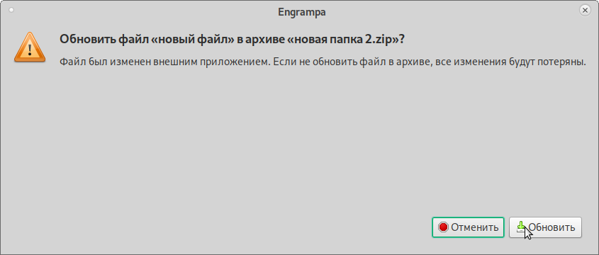 4. Менеджер архивов запросит подтверждение на обновление в архиве файла с внесёнными вами изменениями.