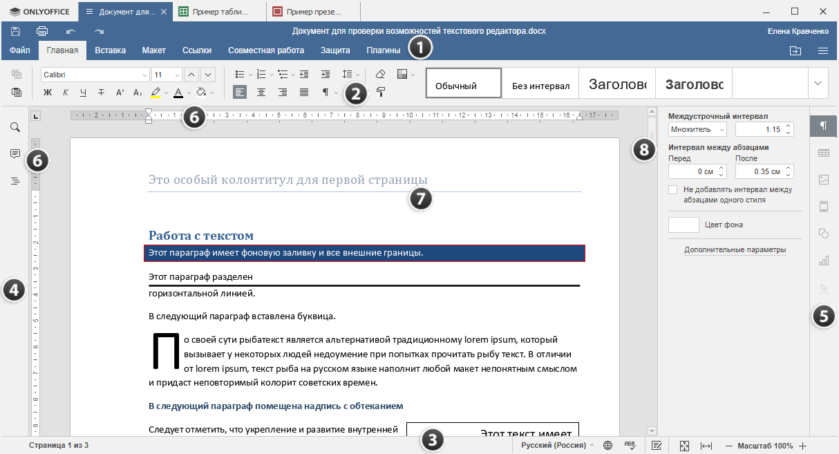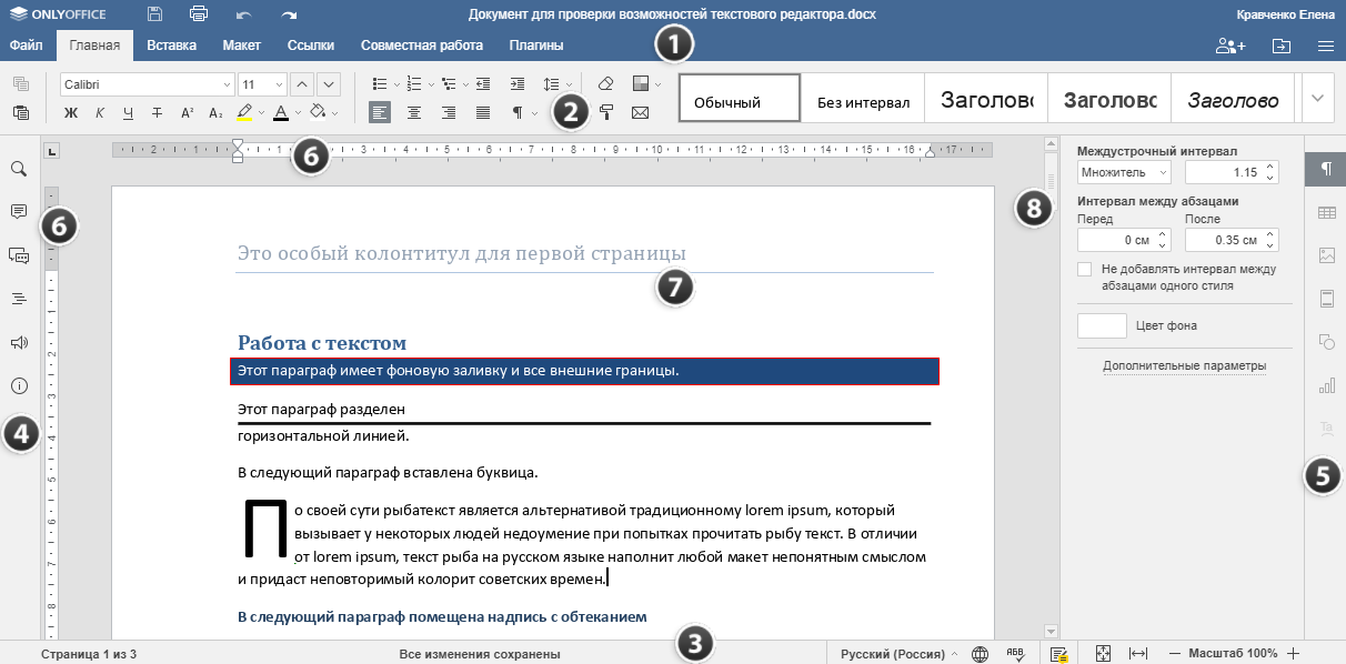 Управление правами доступа (доступно только в онлайн-версии), с помощью которого можно задать права доступа к документам, сохраненным в облаке.2. На Верхней панели инструментов отображается набор команд редактирования в зависимости от выбранной вкладки меню. В настоящее время доступны следующие вкладки: Файл, Главная, Вставка, Макет, Ссылки, Совместная работа, Защита, Плагины.